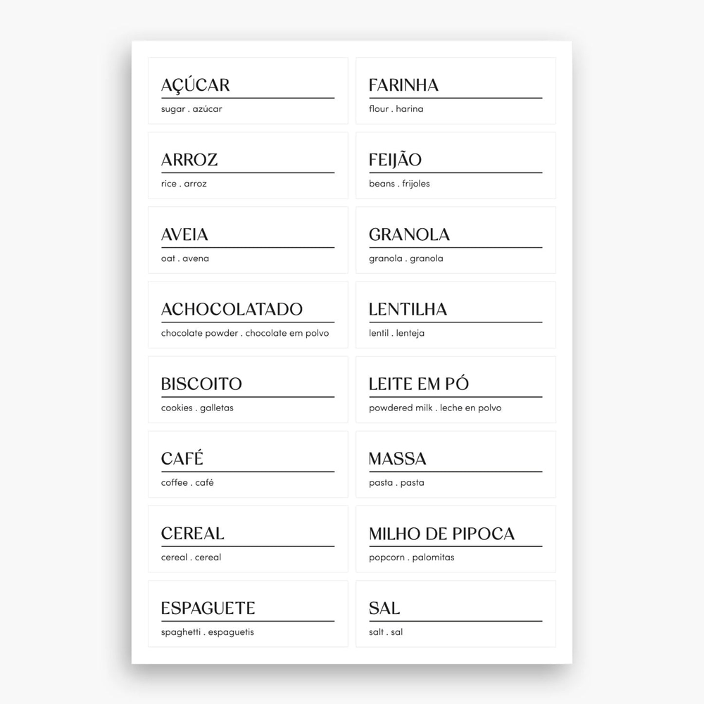Adesivos Mantimentos: Açúcar, Farinha, Arroz, Feijão, Aveia, Granola, Achocolatado, Lentilha, Biscoito, Leite em Pó, Café, Massa, Cereal, Milho de Pipoca, Espaguete, Sal.